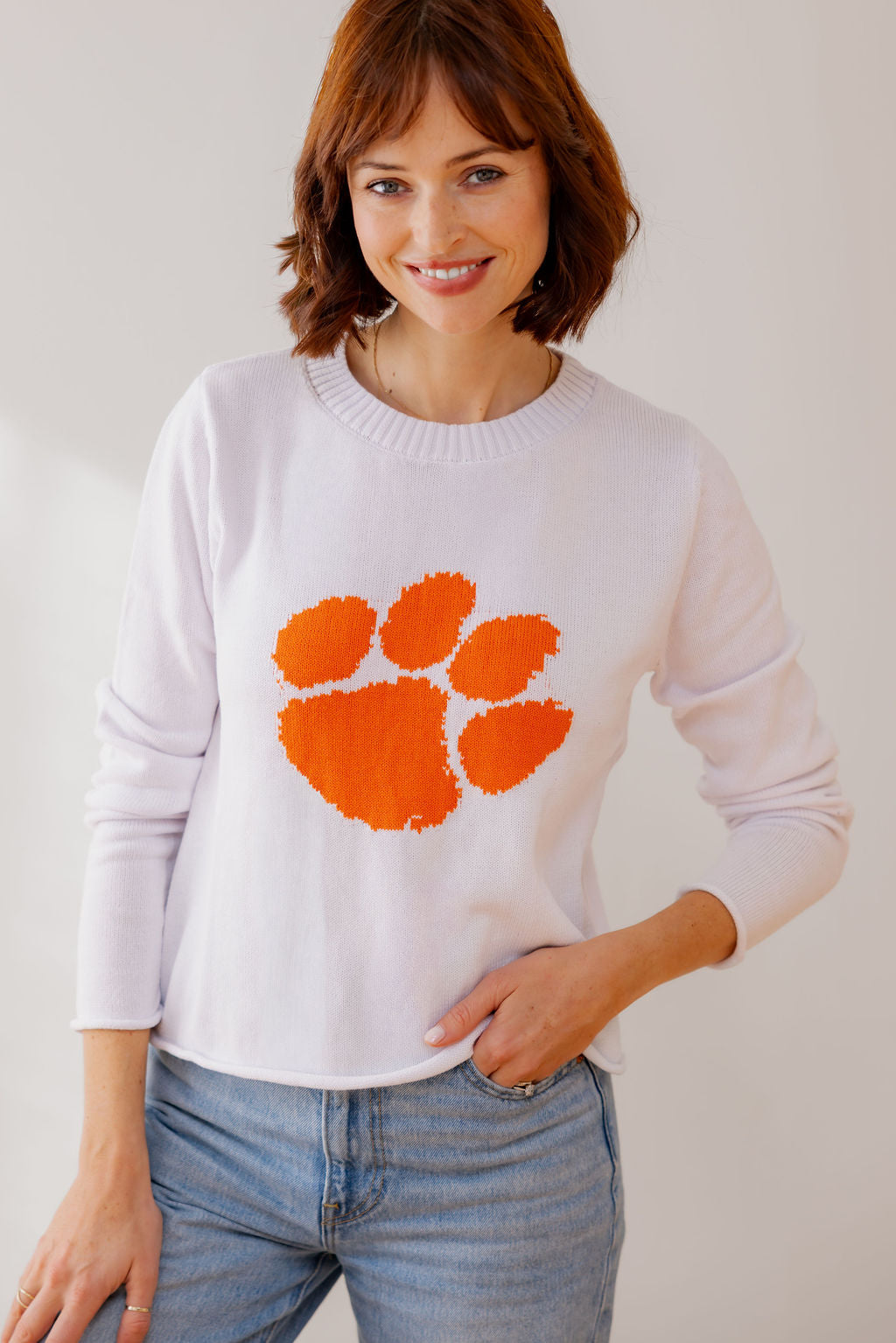 Whether you're spending Saturdays in Death Valley or showing off your tiger ride from afar, our Clemson PAW lightweight cotton sweater is your go-to for every season. Designed with a relaxed, flattering fit, this classic crewneck features the iconic orange paw on soft, breathable white cotton- making it the perfect blend of preppy and spirited. Ideal for Clemson students, proud alumni, or any true Tiger fan. This sweater pairs effortlessly with cut-off shorts, a cute white skirt, white jeans, or tossed casually over your shoulders for tailgates and campus strolls. A must have for game day and beyond.