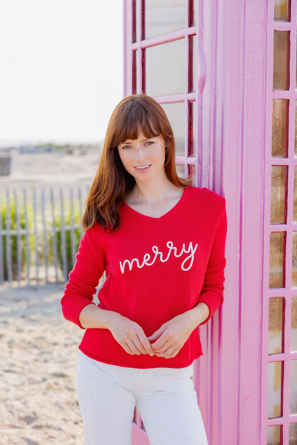 Spread holiday cheer in effortless style with our lightweight cotton V neck sweater. Designed in the perfect holiday red with crisp white script. This cozy yet breathable knit is perfect for holiday gatherings, winter getaways and all season layering. Classic, cheerful, and timelessly preppy- this sweater is the perfect way to celebrate the season in Pearls & Camo style.